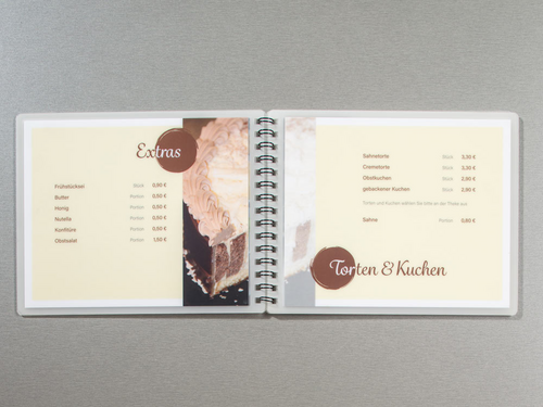 Weitere laminierte Produktideen für die Gastronomie sind beispielweise laminierte Tischsets und laminierte Aufsteller oder einlaminierte Untersetzer. Wir beraten Sie gerne und geben Ihnen Tipps. Gerne können wir Ihnen zur laminierten Speisekarte auch die passenden Aufsteller liefern oder binden Ihre laminierte Speisekarte, aber auch die laminierte Getränkekarte zu einem Buch, beispielsweise mittels Wire-O-Bindung.